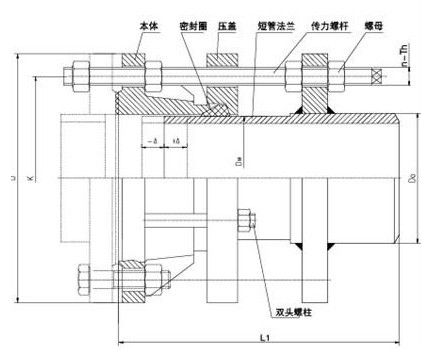 2、該產(chǎn)品采用金屬鑄造或焊接組成,松套部位選用梯形橡膠密封圈,在壓蓋和螺栓的作用下利用橡膠壓縮彈性變形原理。迫使密封圈變形于接頭本體伸縮管外壁之間進(jìn)行靜密封。金屬和密封圈嚴(yán)格按使用性能及用戶要求選用。材質(zhì)外部涂裝高強(qiáng)度防腐漆料,各部連接螺栓為高強(qiáng)度碳鋼或不銹鋼制作。